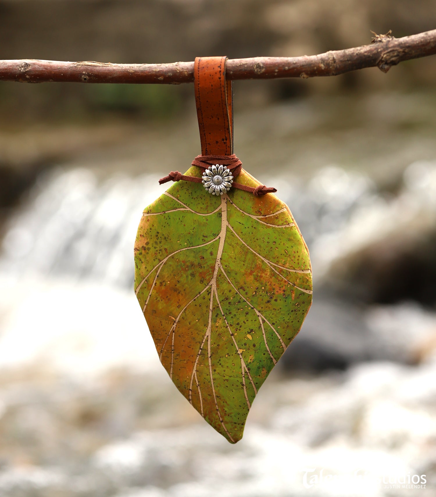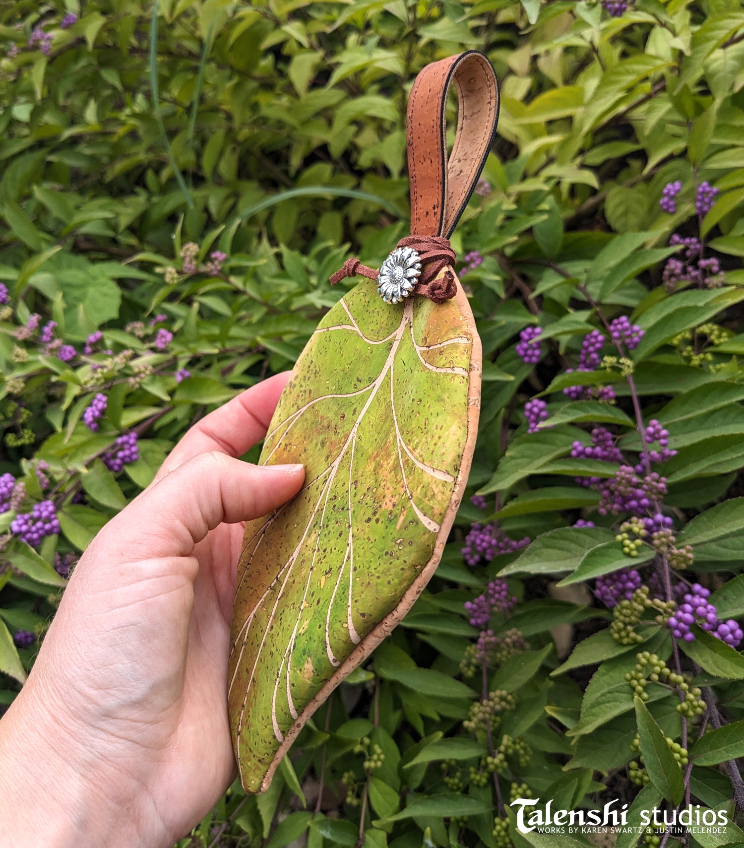 A magical handmade leaf shaped zipper pouch made of cork leather. This size is large enough to hold credit cards, earbuds, trinkets, keys, and more. Each one is hand painted before being engraved and then embellished with either a silver or brass button on faux suede cord.