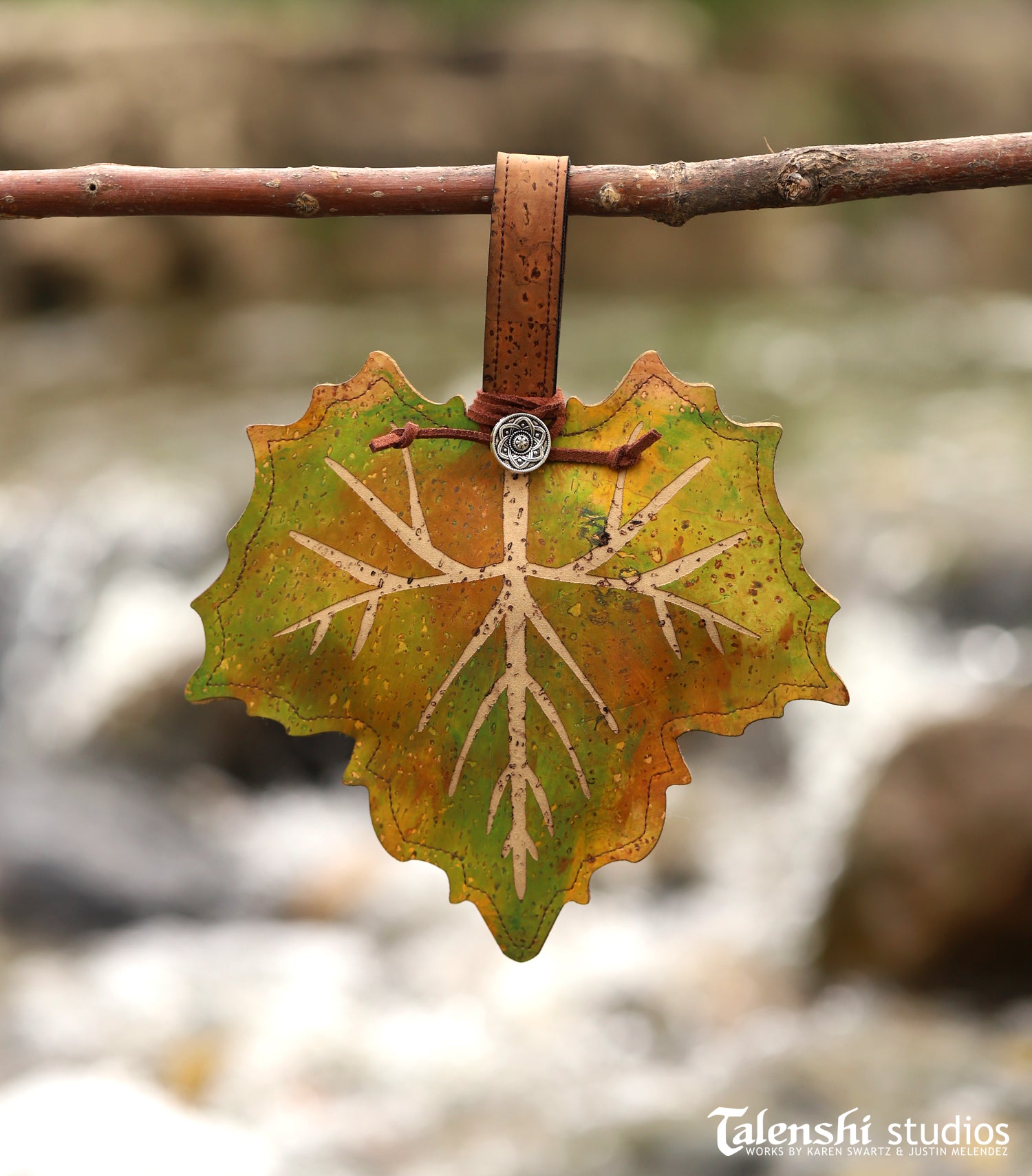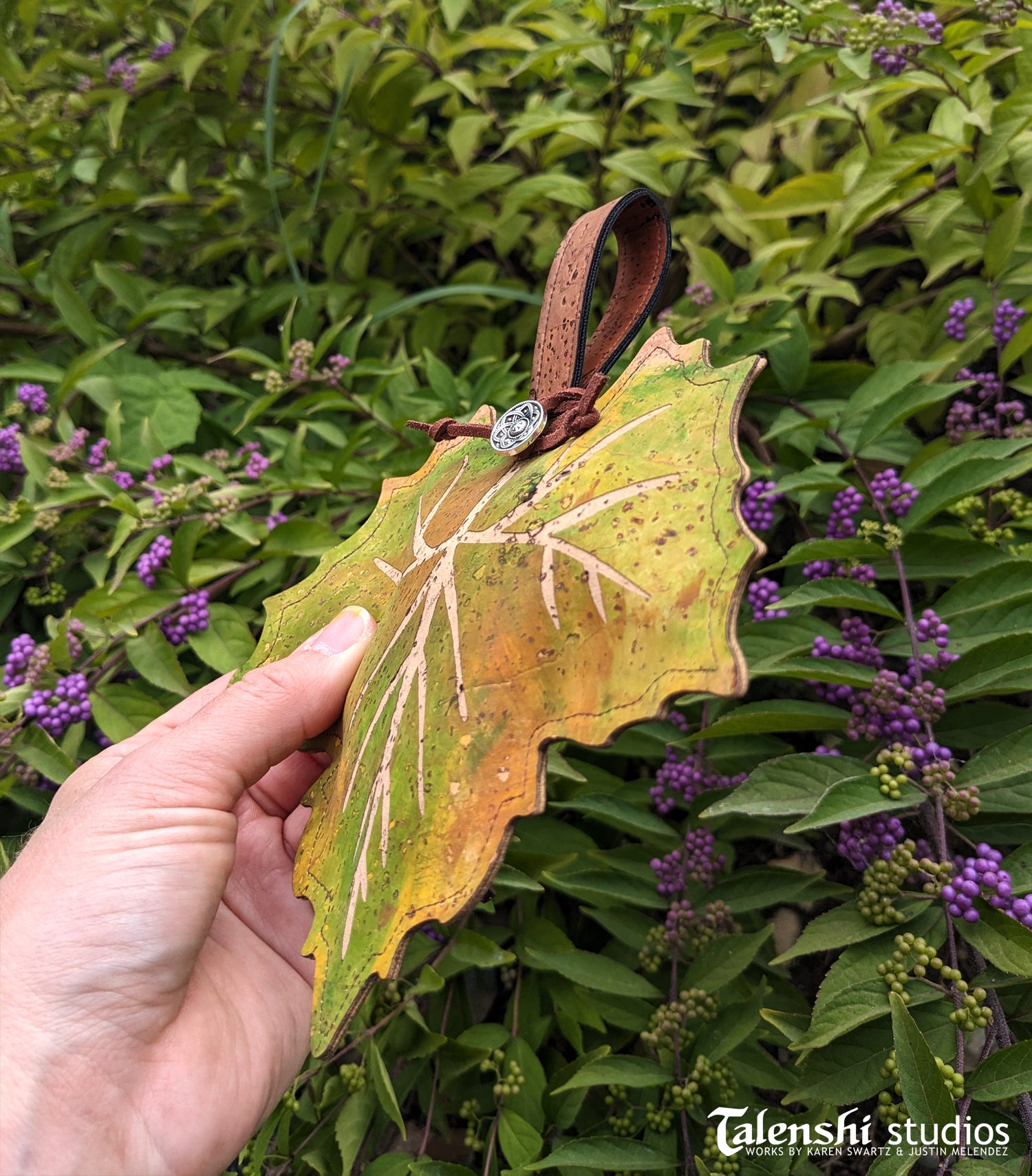A magical handmade leaf shaped zipper pouch made of cork leather. This size is large enough to hold credit cards, earbuds, trinkets, keys, and more. Each one is hand painted before being engraved and then embellished with either a silver or brass button on faux suede cord.