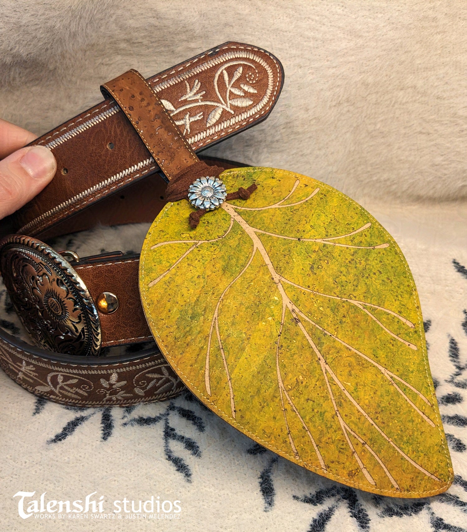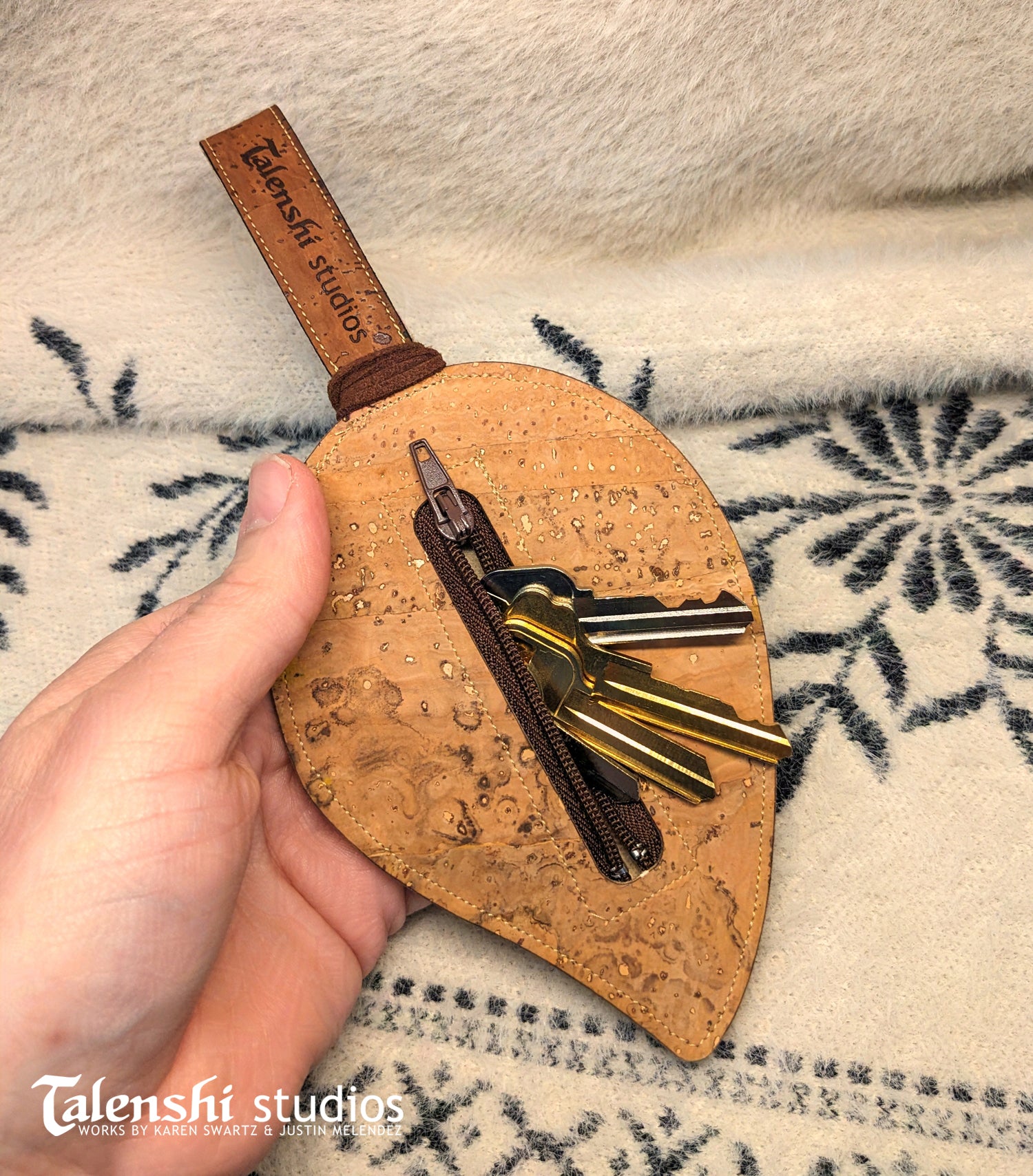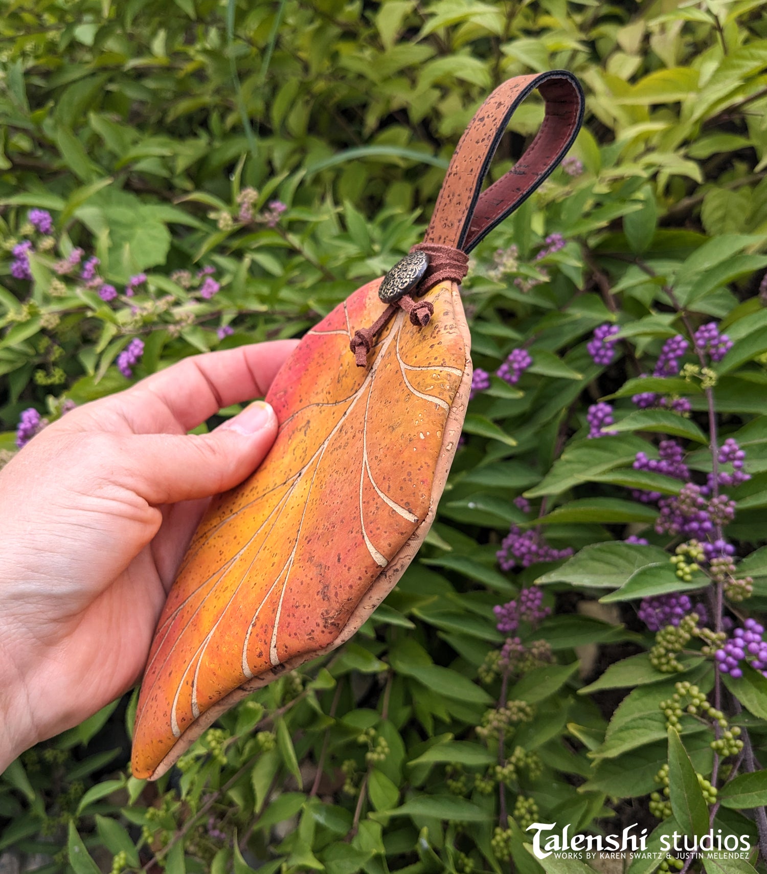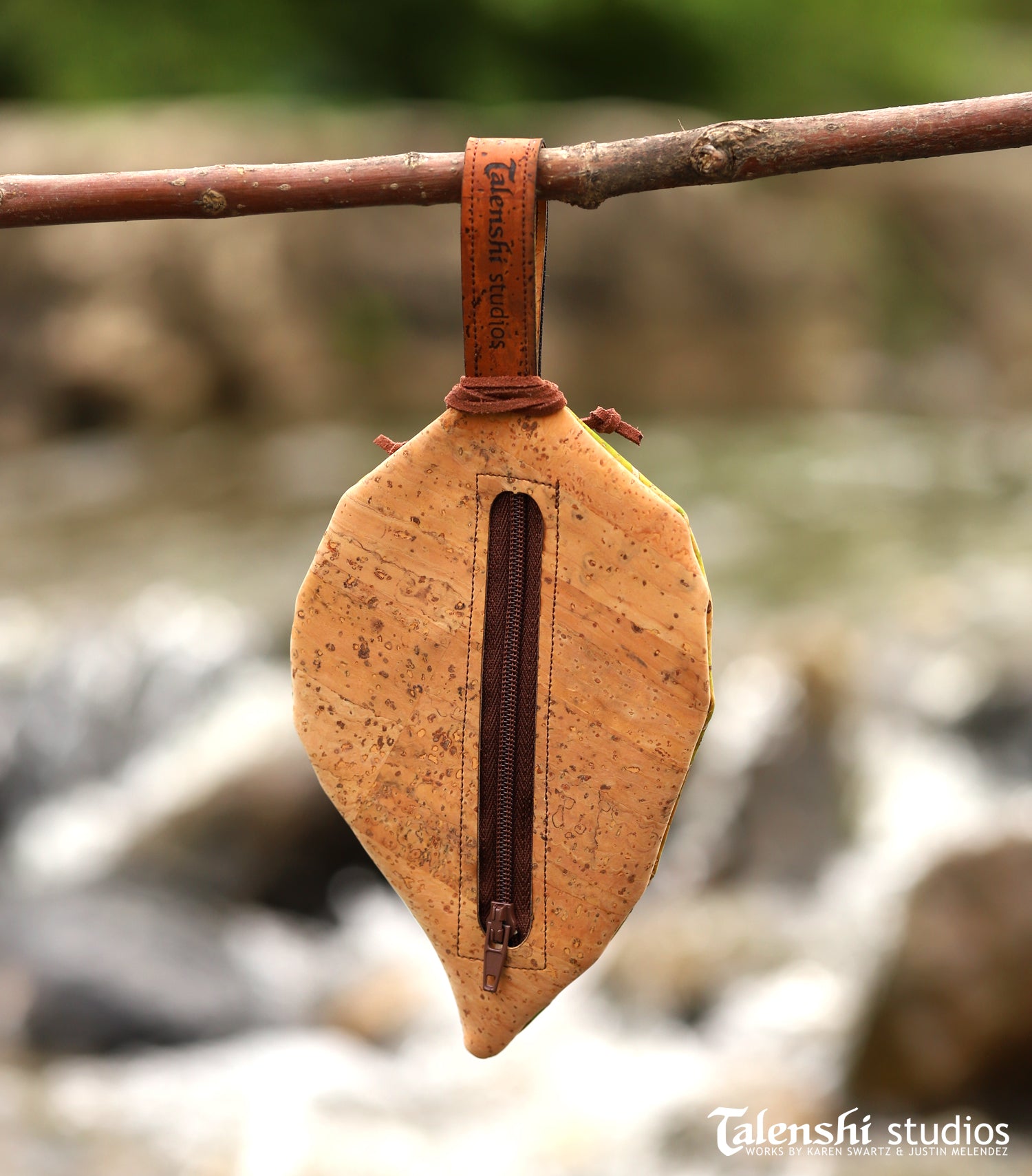 A magical handmade leaf shaped zipper pouch made of cork leather. This size is large enough to hold credit cards, earbuds, trinkets, keys, and more. Each one is hand painted before being engraved and then embellished with either a silver or brass button on faux suede cord.
