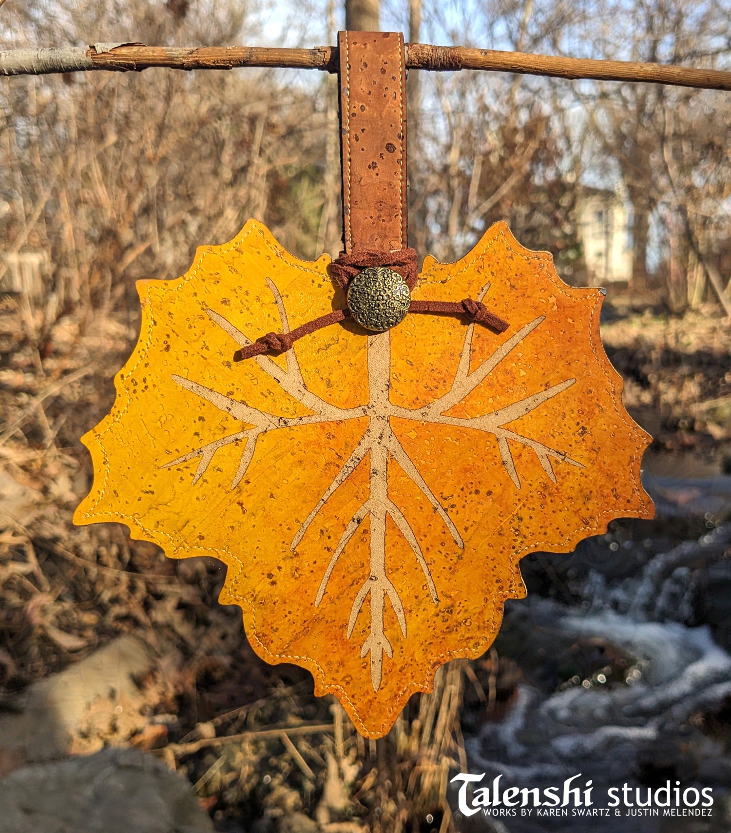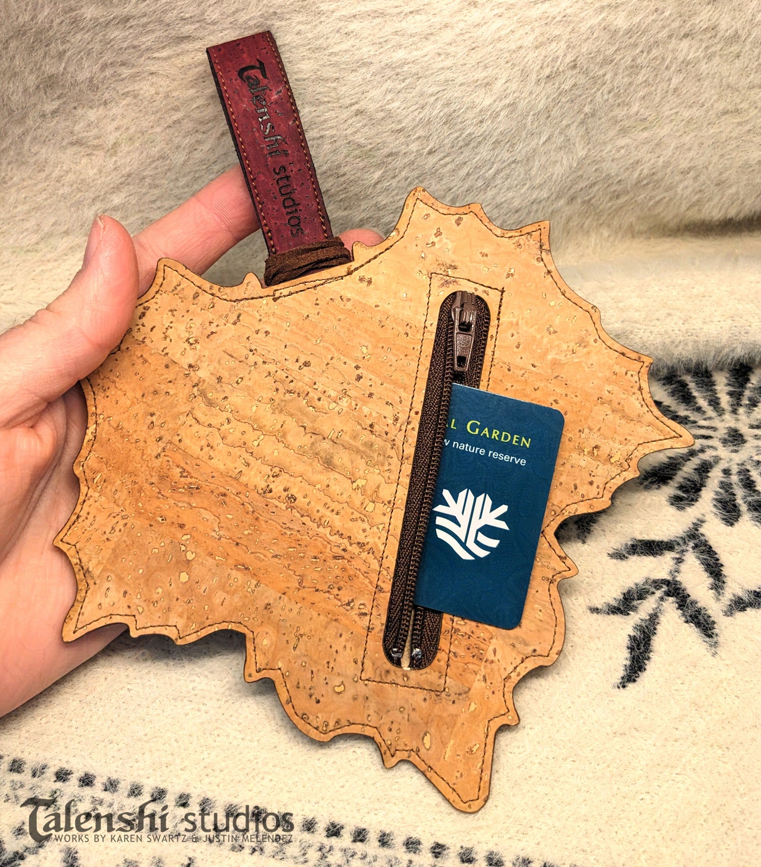 A magical handmade leaf shaped zipper pouch made of cork leather. This size is large enough to hold credit cards, earbuds, trinkets, keys, and more. Each one is hand painted before being engraved and then embellished with either a silver or brass button on faux suede cord.